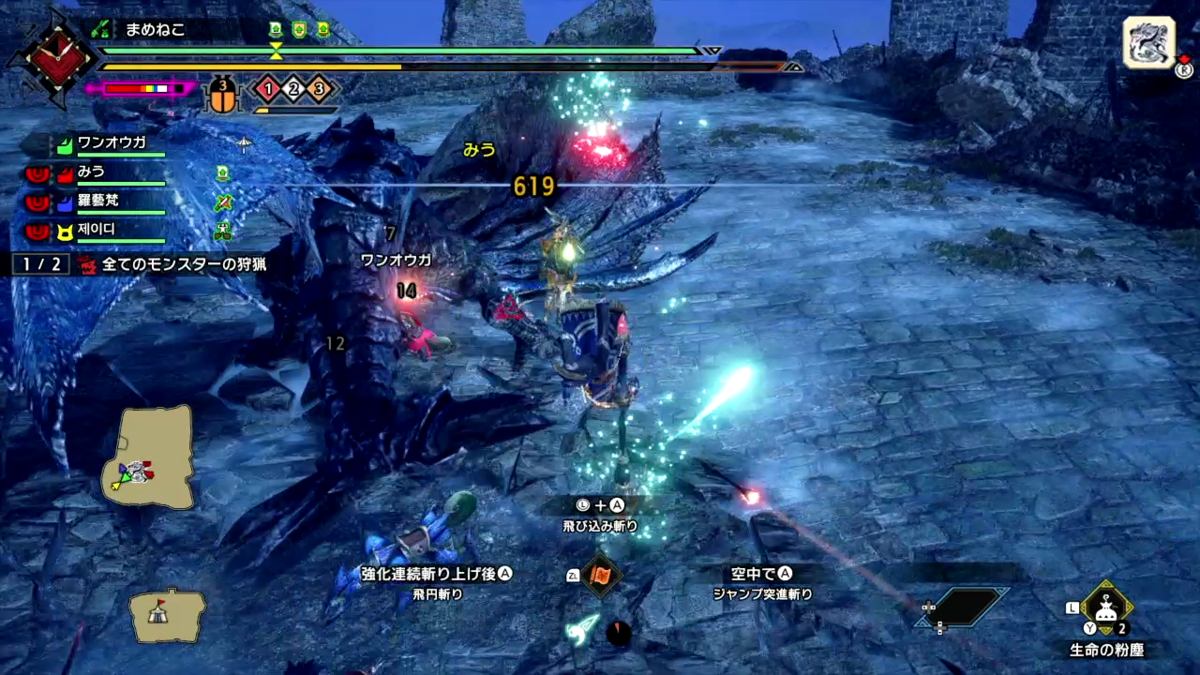 でも、ちゃんと大技出したこの後はスキが出来ているので、ここから空中回避と翔蟲で一気に接近して攻撃しております。